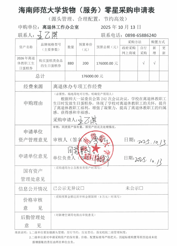 现对2026年离退休教职工生日蛋糕提货券采购进行公示如下,公示期:2025年10月14日至2025年10月20日,如有异议,请致电0898-65886240。特此公示。